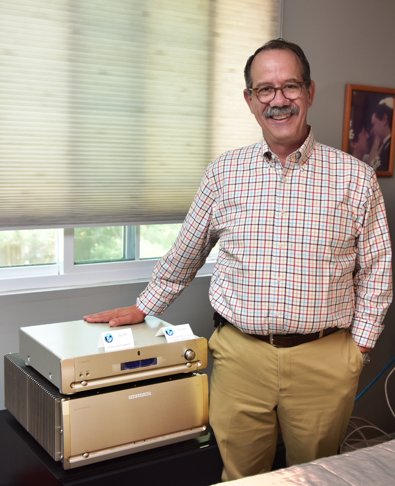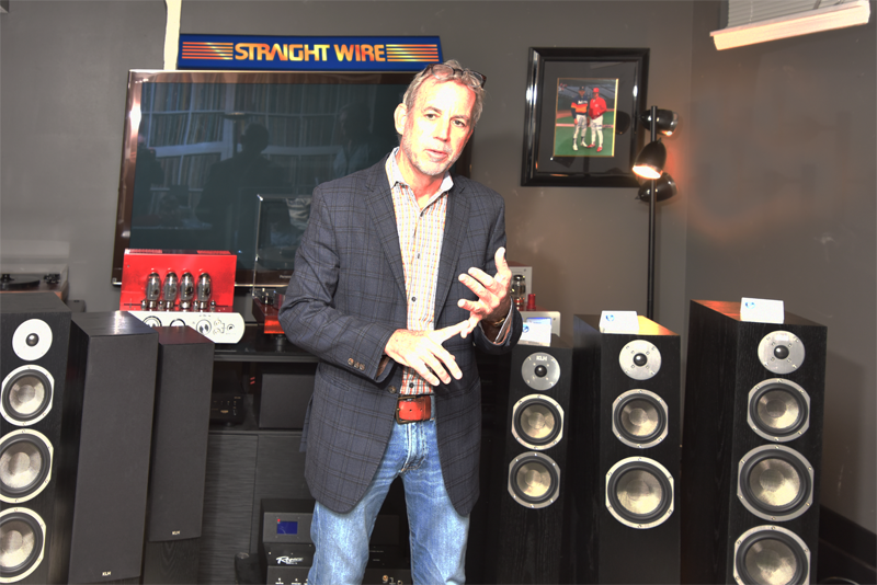 In the lower level sound room, Patrick Thompson, National Sales Manager, from KLH Audio Speakers, presented three-floor standers including the Cambridge, the Quincy, and the Kendall.