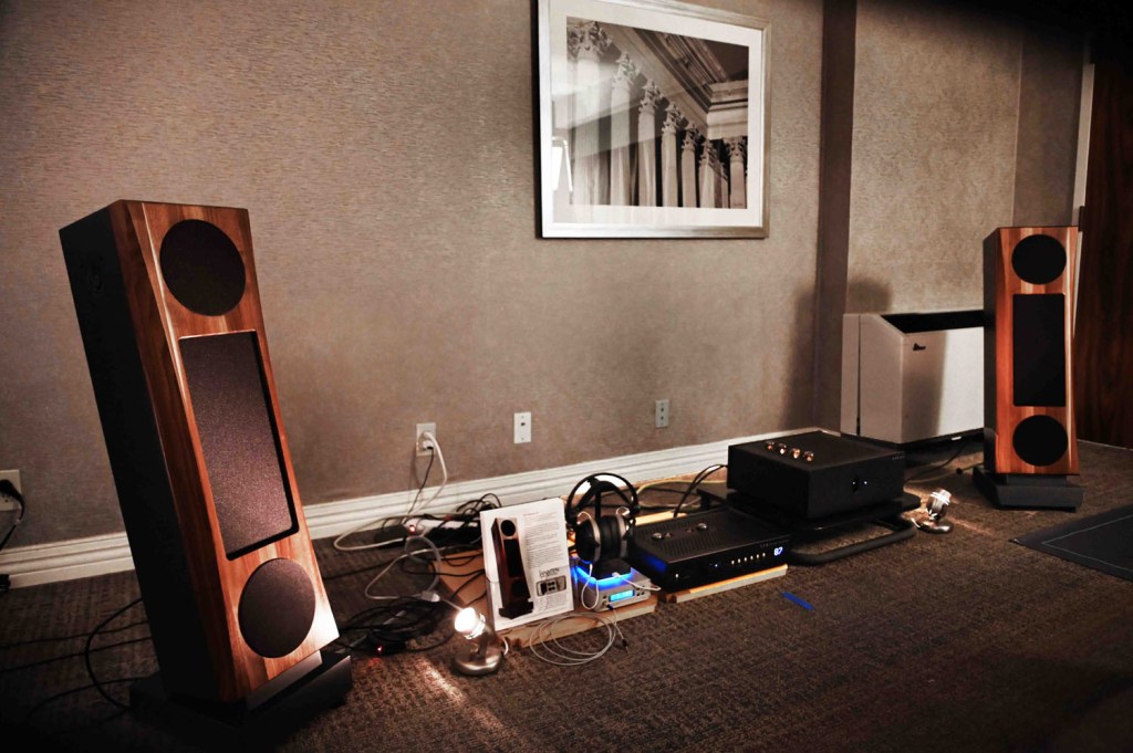 What’s great about these exhibitions is you get to see and hear equipment you would never experience anywhere. One such product in room 523 is the MC Audiotech Forty-10 from just outside of Philly. This is a full range two-way system with an unusual cloth covered curve array consisting of 100 in house designed drivers covering 100Hz to 20kHz sitting on a bass unit which they call a folded cube. I believe it is two 18 woofers firing in to a chamber that is ported out the back. Each woofers back wave is ported out its respected grill on the front. This design provides a very efficient way to plumb the depths to 20 Hz. Efficiency is stated as 93-96 db at 1 meter. The sound was very full of life. I liked it.