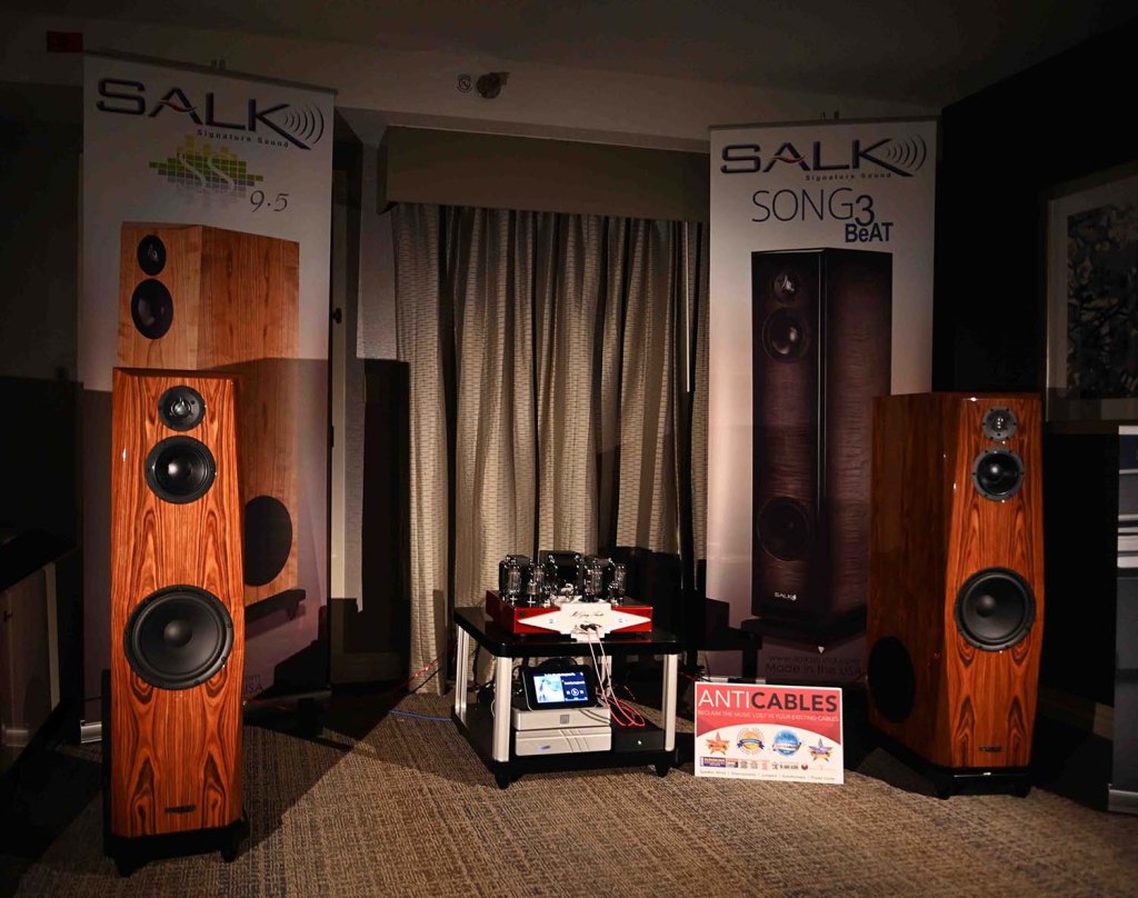 Also up on the 5th floor was the Salk/McGary room. Jim Salk of Salk Sound has brought his beautiful speakers to almost every CAF. He was at the first CAF in 2010 where I met Jim and heard his speakers for the first time. I was taken aback first by the exquisite craftsmanship of his woodworking. I am a bit of a woodworker myself and I know how difficult it is to finish a product to the level that Jim does. Then there is the sound. Salk has always presented a wide, deep and musical image. For the past two years Jim has been exhibiting with Mike McGary’s amps. Mike has been hand building these amps in Virginia. Mike was showing his new SA-2 KT88 P-P 80 watts/channel. These are classic push-pull amps with some innovative takes on biasing and powering the output tubes. Whatever Mike does the results is most musical with detail and speed to keep young ears happy.