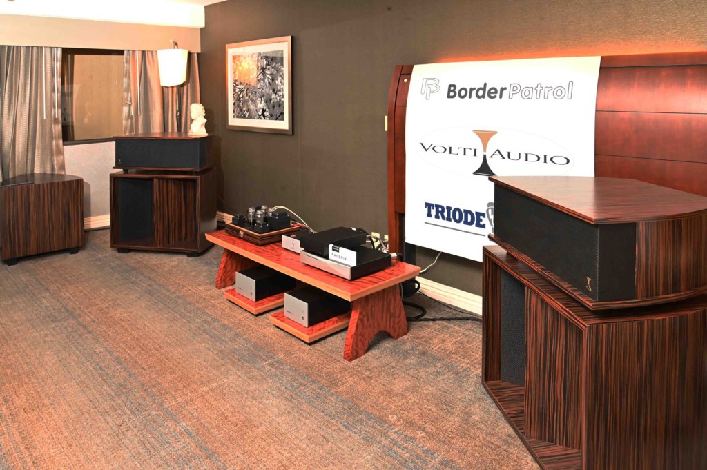 Volti Audio, BorderPatrol, and Triode Wire Labs have been exhibiting together for a number of years and each year at whatever show always get very high praise. This year they managed two rooms. Room 316 with Volti top of the line Vittora system is a fully 3 way horn loaded system including an ELF (Extended Low Frequency) cabinet. I do not think the ELF is needed in these bass heavy hotel rooms, but Greg let me know the low frequency push is fully adjustable. The music was so involving. One just wanted to sit and toe tap the day away. Volti’s tagline is “Just Have Fun” and that is just what his speakers make you want to do. The rest of the equation for this pure musical experience is the BorderPatrol electronics. This represents over 30 years of exploration into what makes a electronic circuit get out of the way of the music. Gary Dews will not make changes for change sake and just keeps producing musical amps, preamps and DAC’s. If there was ever a question whether one should go with either digital or analog front end the the answer is is found in this system. And speaking of this the system, a big part, is the cabling. The synergy one gets with a complete cabling from one company for the whole system is quite obvious. Pete Grzybowski of Triode Wire Labs takes great pride in hand constructing every one of the cables he sells. They are made some of the best wire stock every made. These are most likely the best sounding cables at any price, but sell for a very reasonable amount. These cables are the best value out there. The same can be said about the system in room 309. Just about the only differences were the Volti Audio Rival speaker. This speaker is about one third the cost of the Vittora but can rock out pure music like its big brother. Greg was also showing in static display the new special edition version with curved sides to improve internal resonances.