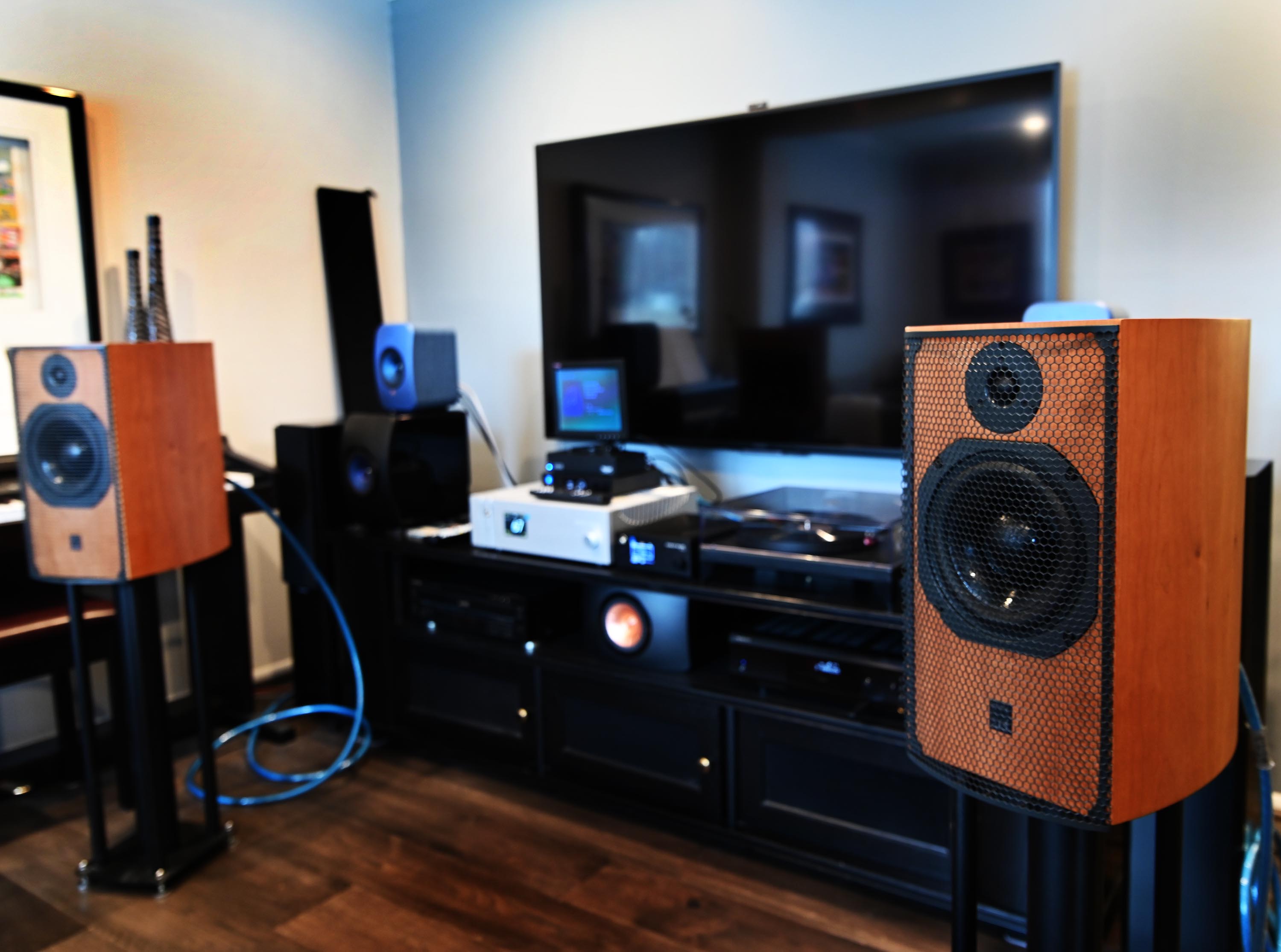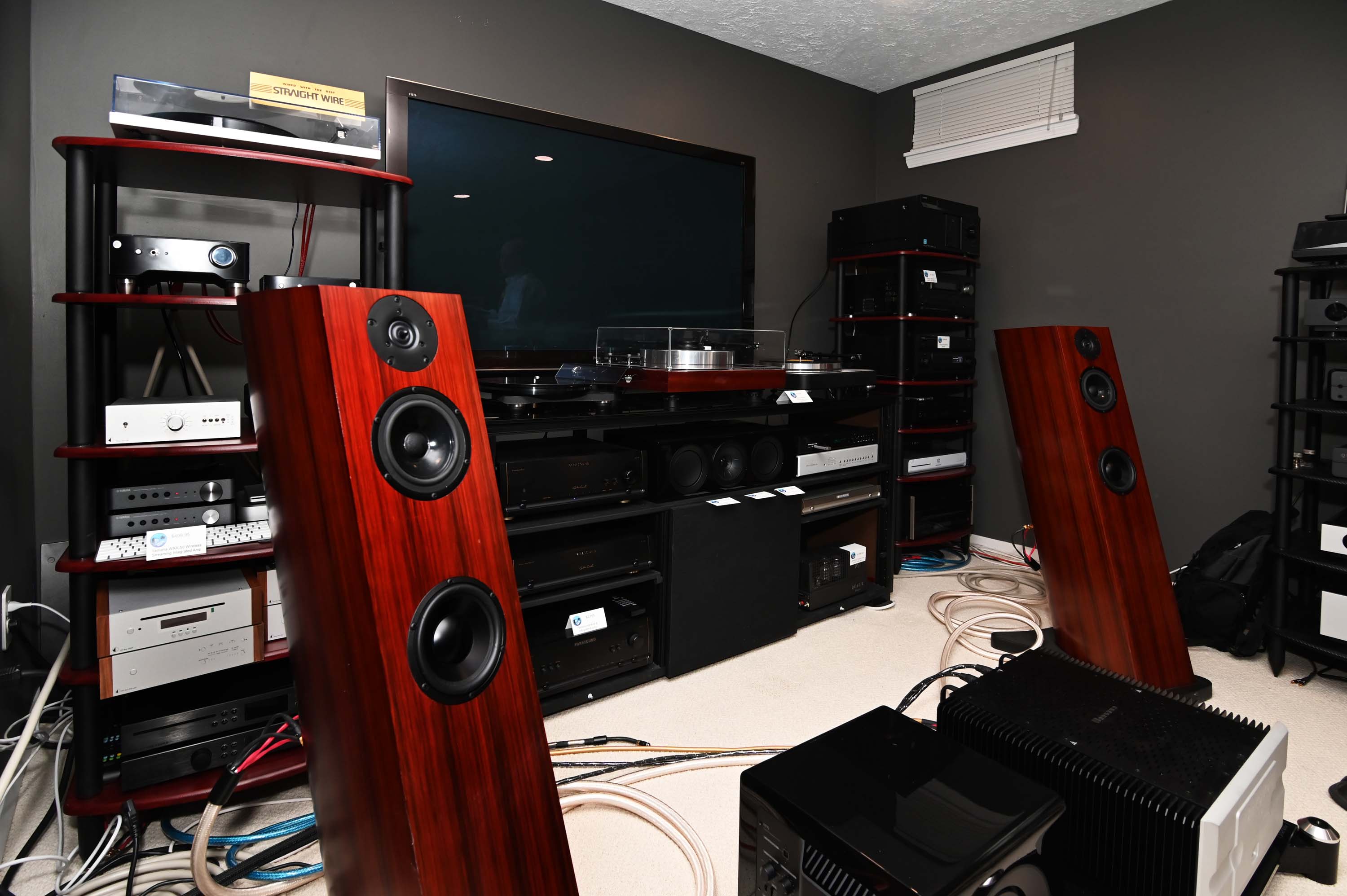 In Russ’s basement showroom he had Sonner Legato Duo’s that are just plain fine. These are 2.5-way bass ported enclosure with a reasonably high sensitivity of 90db and a freq range of 37Hz to 23kHz. I wish I could have spent some quality time with them. I have only heard the smaller monitor styles at the audio shows and loved them. Bryce Allen from Rega was showing off the Rega Planar 8.