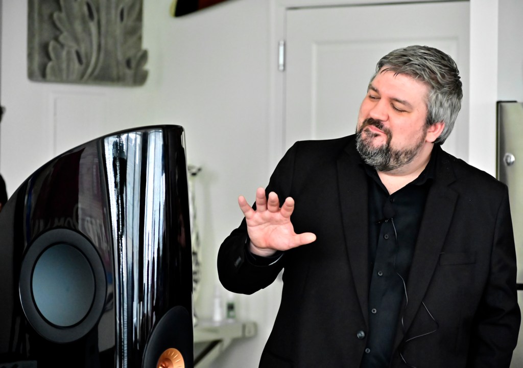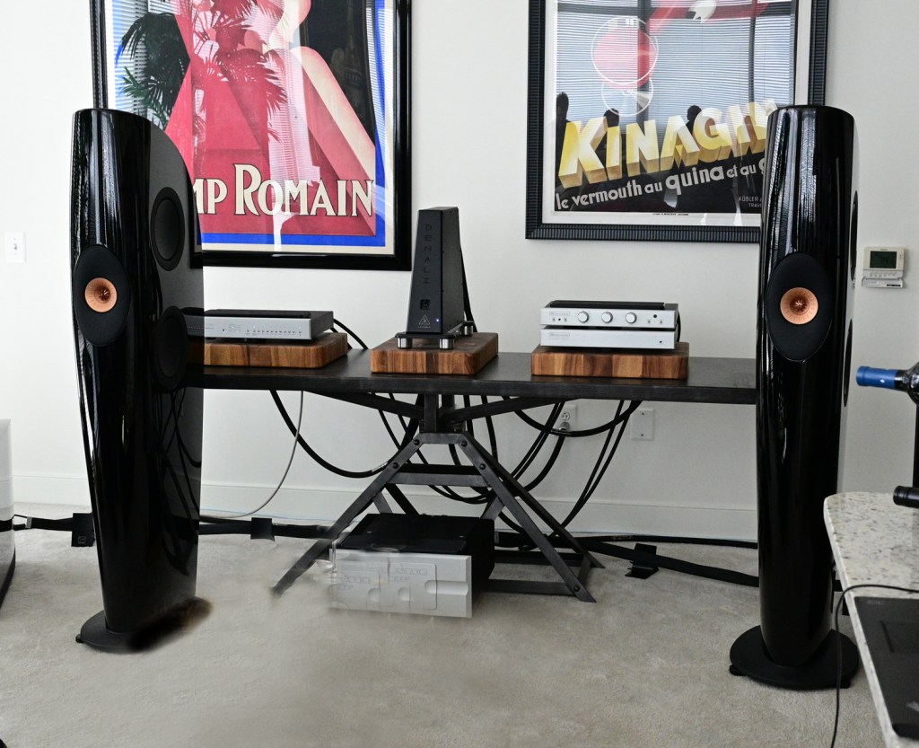 The KEF Blade One Meta’s were the star of the show. Ben Hagens, KEF Product Training Manager, talked about KEF’s design history and backstories that kept us focused on the marvelous sound of the beautiful speakers. I have heard earlier versions of these speakers at Audio Shows and this version with the Meta disk behind the Uni-Q driver brought more clarity and coherence to the music.