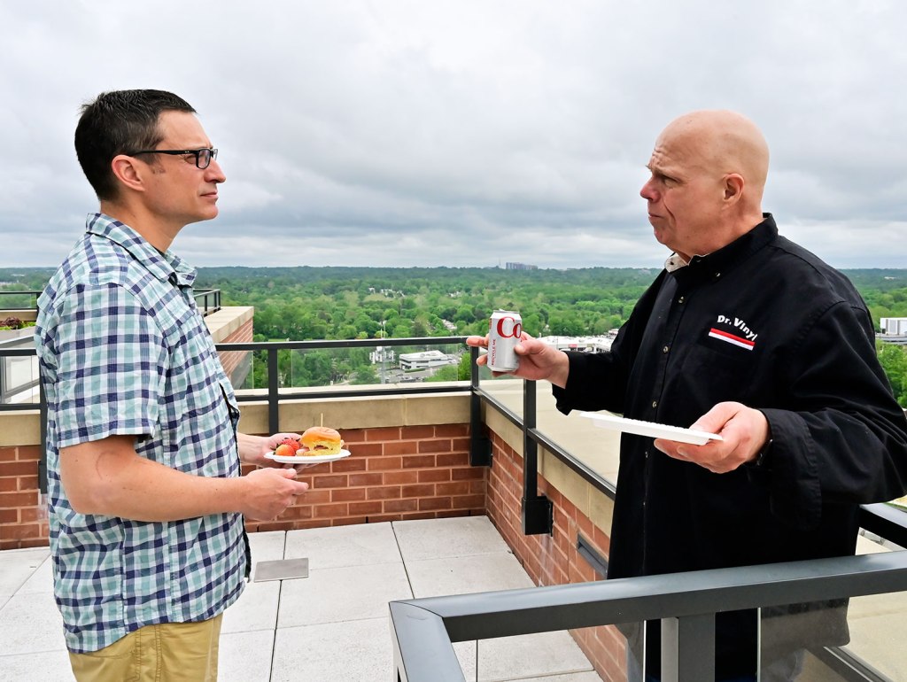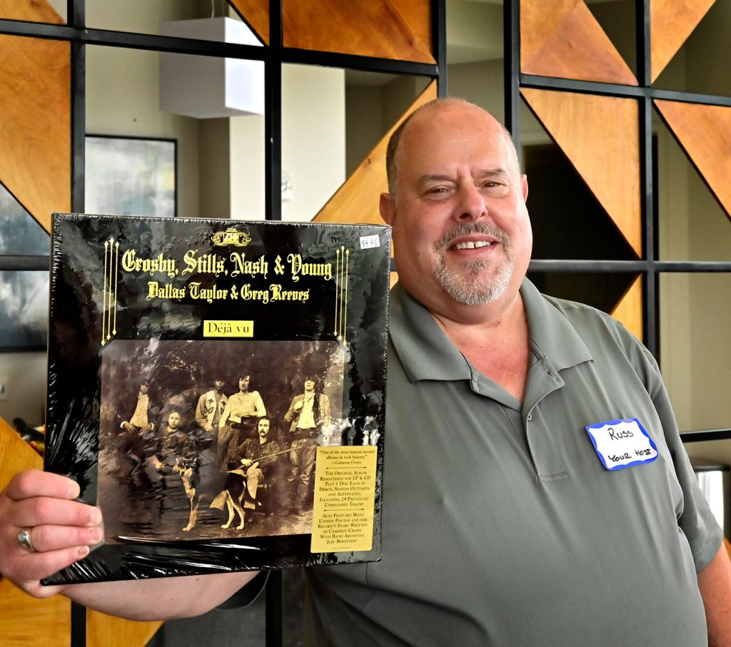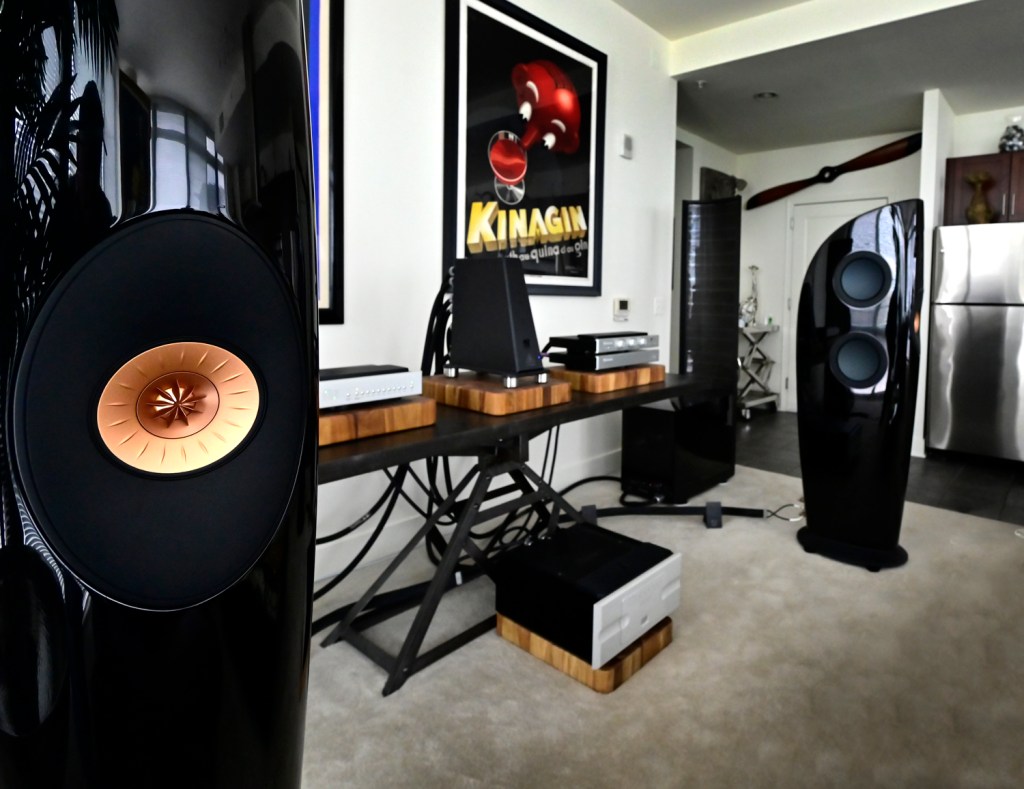 This was a real treat. We gathered on a Saturday at Ron Ziegel’s incredible Penthouse apartment and party room for a great afternoon of food, drink, tunes and camaraderie. There was a good crowd of forty or so club members and guests. Russ made eight trips from his Columbia townhouse to set up two large systems and a countertop of LPs for sale. We had the big Quad ESL 2912s with Hegel electronics in the Party Room and the KEF Blade One Meta’s and Martin Logan Renaissance ESL 15 A’s in Ron’s Living room.