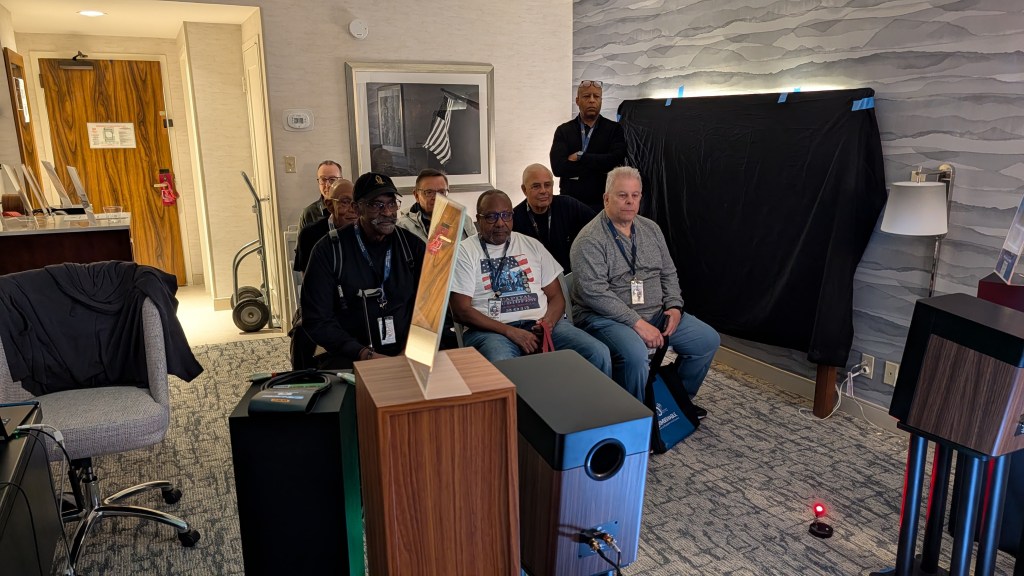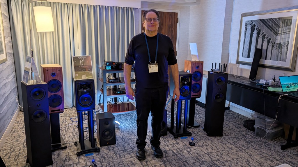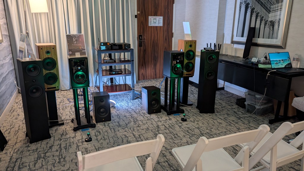 The DC Audio Group room offered three systems intended to demonstrate what can be done for very modest sums. My favorite was the “Tier 2” middle system, which featured the HiVi Swan DS 3.1 Mk II speakers, a Wiim Ultra music streamer, and an SMSL VMV A1Pro amp. Despite the ridiculously-low price of $1300 for the whole system, the sound was refined, dynamic and full-bodied, with images that were untethered to the speakers.