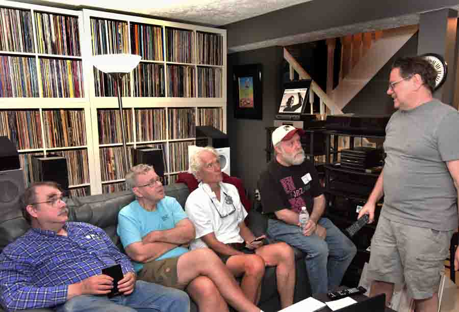 The gathering started off slowly and I was a bit nervous about the possibility of a low turnout due to the great weather. But it did not take too long for the room to fill out to a nice crowd. Thinking about this as an afterthought, it was one of the best meetings ever. I cannot really say why but the vibe was great. It could not have been the broccoli pizza, but something was in the air that just made me feel good about being there. Even the sound system was musical. John set up a really neat kit that presented good tunes to a fairly large room. We had digital files served up by a Macbook Pro into either Prism Callia or Mytek DAC. Boosting the signals from the sources was handled by Rogue tube electronics with RP-9 preamp and Stereo 100 amp. Johns go-to speakers for this type of installation was the very smooth Amphion Argon 3S.