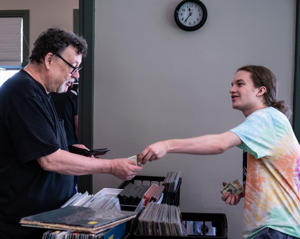 On a warm and sunny Saturday, we had about twelve vendors and individuals presenting their ware for the public to peruse and purchase. Most vinyl sales were brisk, both used and new LP’s, CD’s, and even cassette tapes were available. Lots of vintage gear was available too. The beautiful weather kept the big crowds away but there was a steady stream of participants.